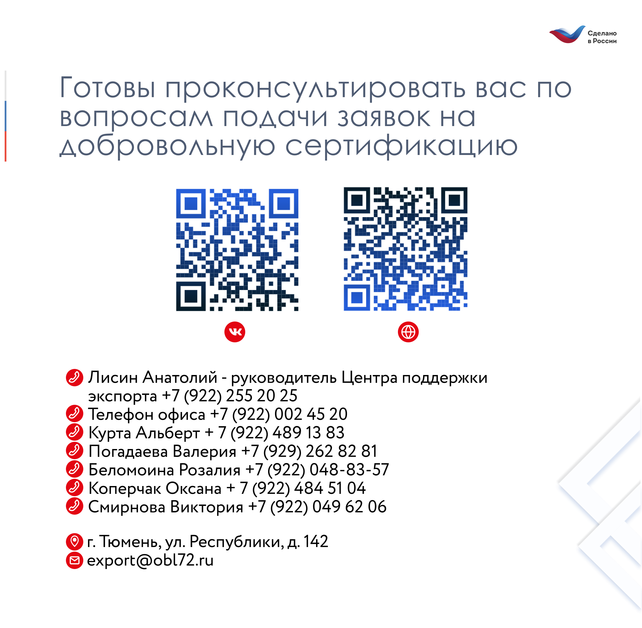 Получить консультацию о программе "Сделано в России" можно по телефону +7 (922) 002 45 20 (Центр поддержки экспорта Тюменской области)