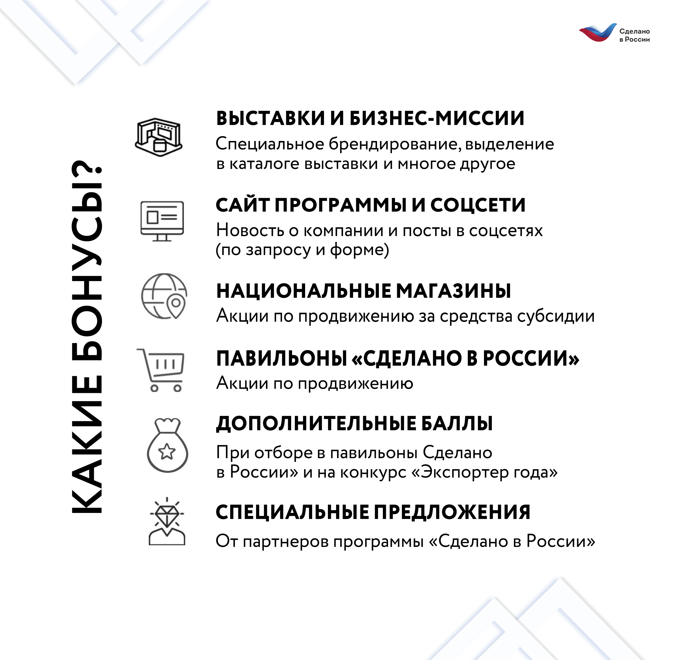 Программа продвижения национального бренда «Сделано в России» направлена на повышение узнаваемости и доверия к российской продукции внутри страны и за ее пределами.
